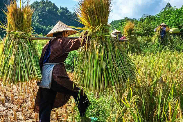 Today, we will take 160 Km drive (3.5 hours) to Mai Chau, a beautiful valley set in picturesque karst formations and rice paddies. On arrival, we check in a house-on-stilt of a Thai family in Pom Coong Village and have lunch. In the afternoon, we will cycle uphill and downhill to many villages dot the hillsides, stop for photo shots or talk with friendly local people. After 3 hours cycling, we will be back to the stilt-house, relax with a cool beer before having dinner. Enjoy a performance dance followed by local rice liquor (ruou can) and spend the night in Pom Coong Village.